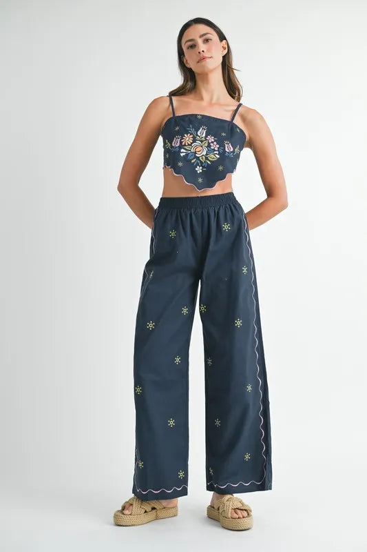 MABLE Elegant Linen Embroidered Scarf Top & Pants Set
